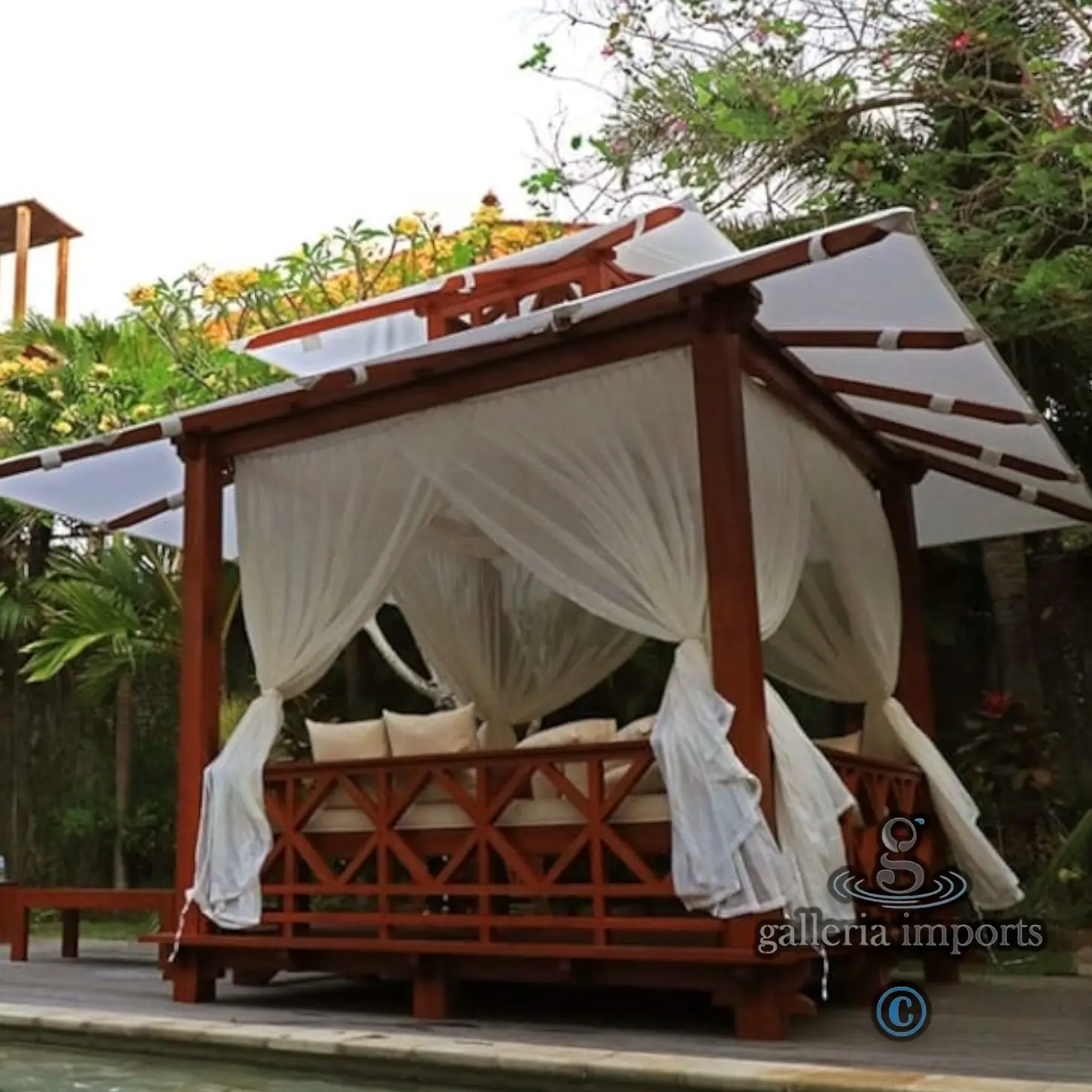 Material: Bengkirai Wood Complete With roof, chairs, cushions etc.